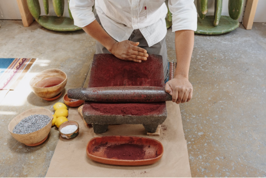 Natural materials have been used to produce dyes and colorants throughout much of human history. The red juice derived from cochineal insects has influenced cultures and artistic practices throughout the world since the 16th century. Pericón, or wild marigold, which is indigenous to Mexico and known for its medicinal uses, is a source of a beautiful yellow dye. In the ancient Zapotec culture, color is an outcome of a deeply spiritual relationship with nature, one in which the spiritual understanding of the cochineal insects, for example, is deeply entwined with the creation of the color red.