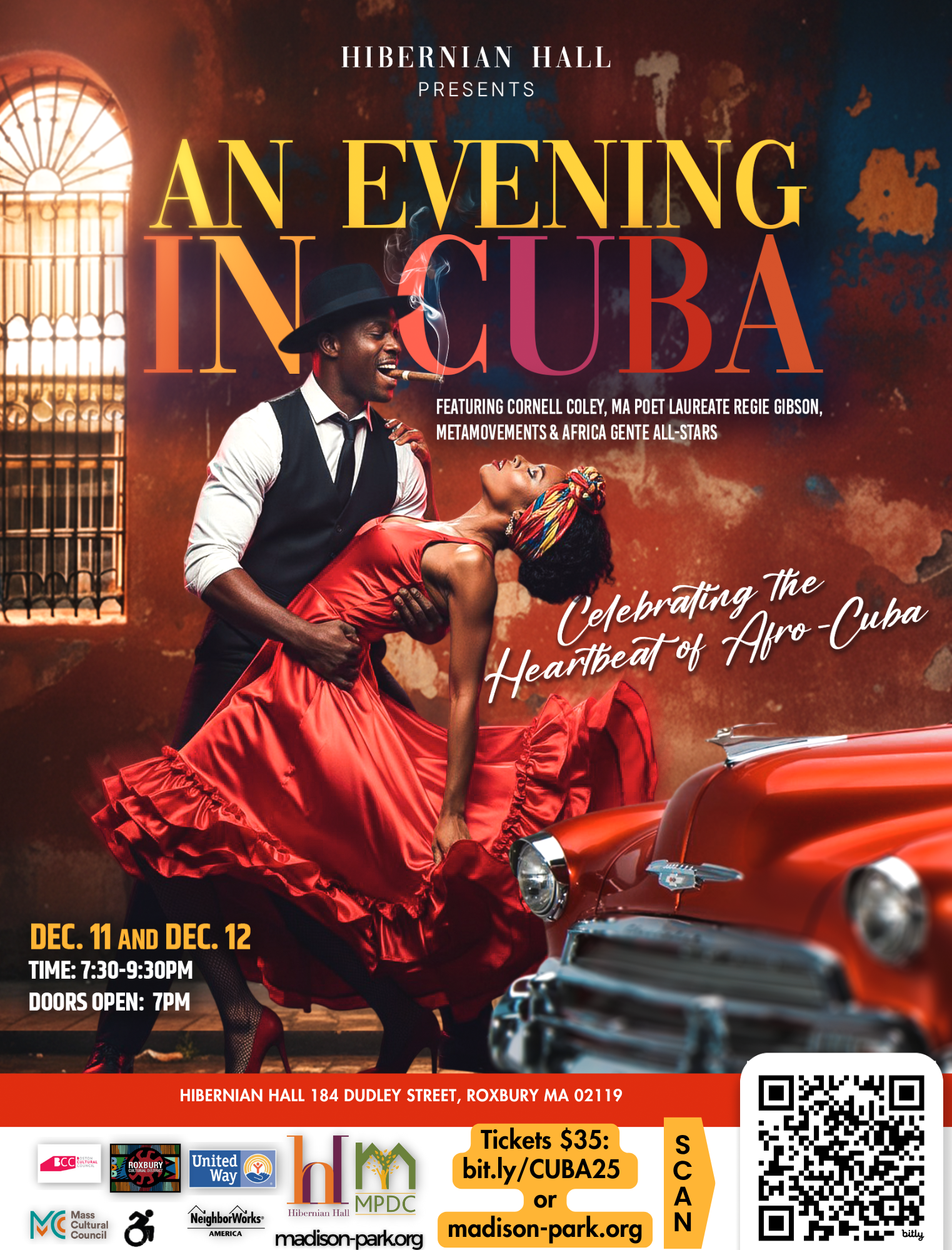 Step into the warmth, color, and rhythm of Cuba — right here in the heart of Roxbury. An Evening in Cuba is a two-night immersive celebration of Cuban culture through live music, dance, and island-inspired flavors that will transport you straight to the heart of the Caribbean.