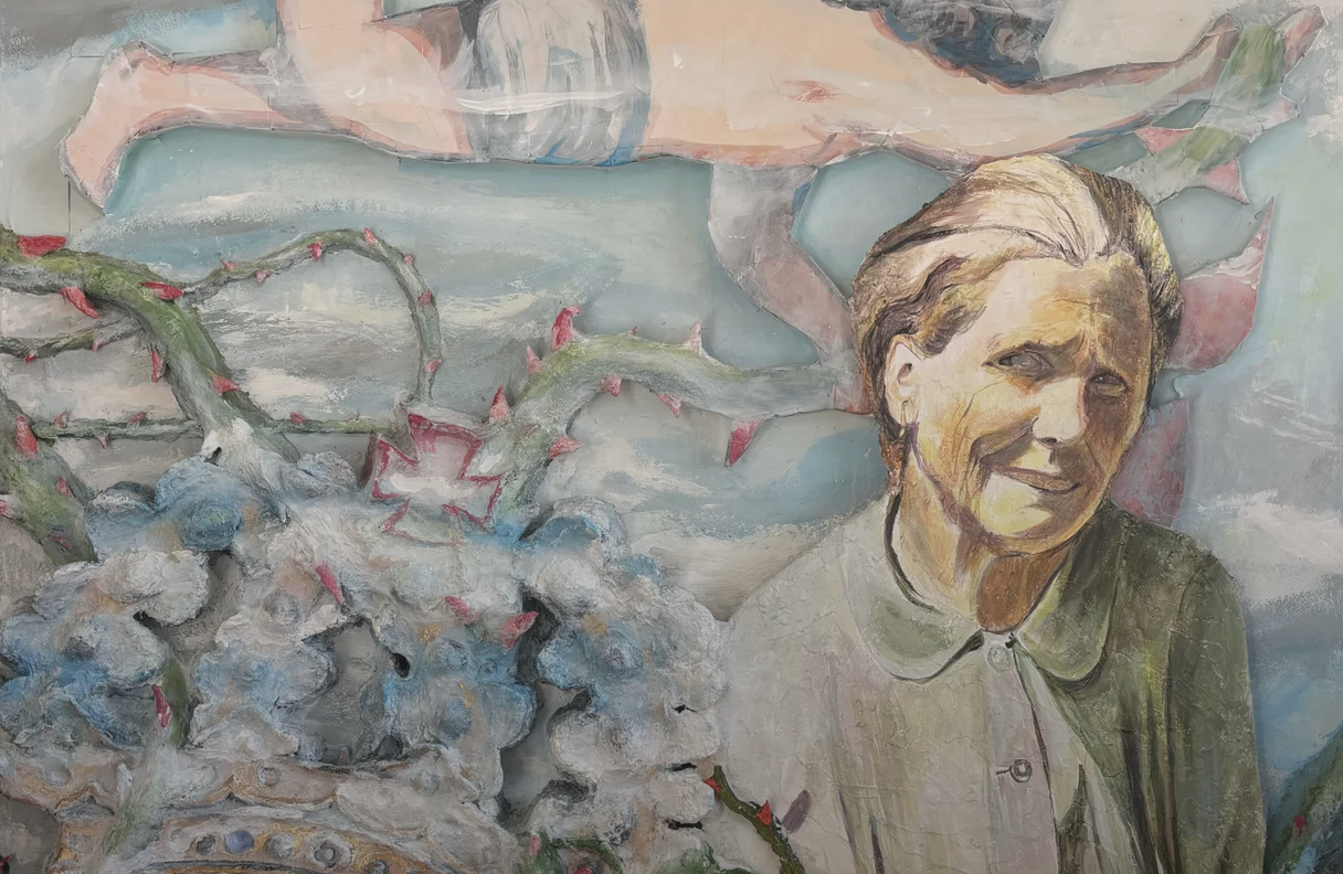 José L. Santos’ new work features large, three-dimensional relief sculptural paintings that reflect his Portuguese cultural roots. The pieces incorporate imagery such as rosary beads, family members, hearts, thorns, Portuguese crosses, and self-portraits, among others. Santos draws inspiration from his personal family history, using photographs to create realistic images that capture the generational evolution of his family—from a time when they lived off the land in Portugal to the contemporary emotions of pain, struggle, and success experienced by those now living in Massachusetts.