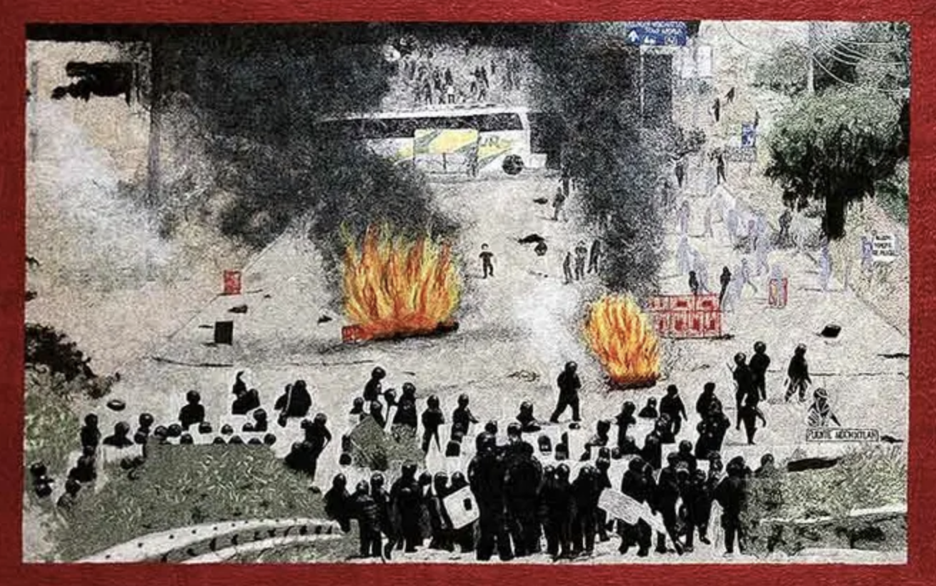 Engaging migrant and local weavers, musicians, Uros artisans from Lake Titicaca in Peru, and master pyrotechnicians from Mexico, the piece offers a powerful anti-colonial counterpoint to traditional U.S. patriotic fireworks displays. The performance transitions from a somber “pyrotechnic battle” to a festive traditional castillo display—towering rotating firework structures typical of Mexican celebrations—in which the galleon’s masts are transformed into the spinning arms of the castillo.